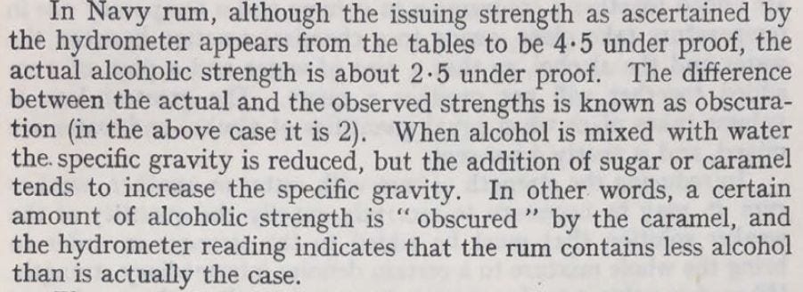 The Royal Navy victualling manual notes that without the added caramel, a hydrometer would measure the navy’s rum at 2.5 degrees underproof. But with caramel, the hydrometer reads 4.5 degrees underproof. In ABV units, with caramel, 54.5% ABV, without caramel, 55.7% ABV.