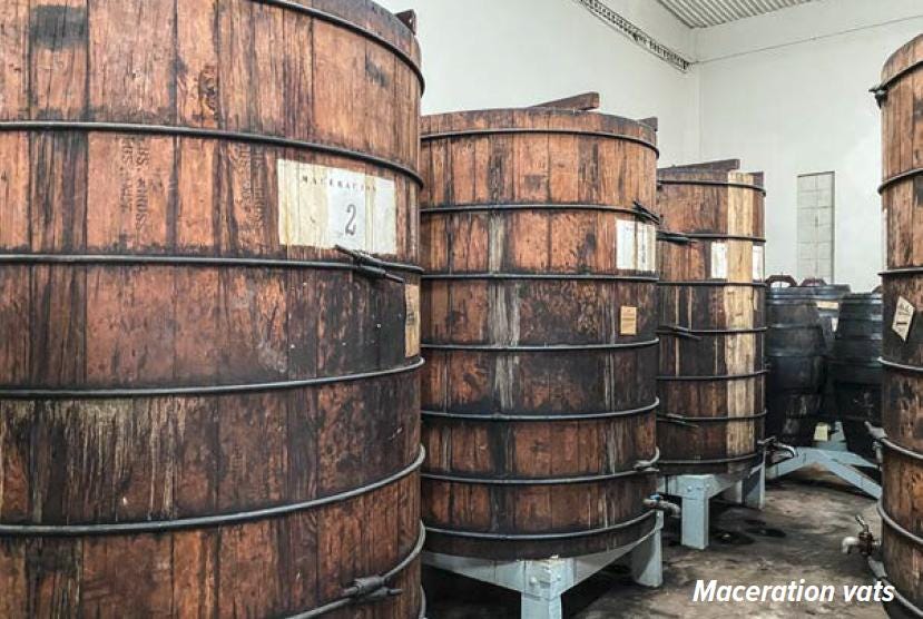 Less than 2.5 percent of that distillate is then macerated with fruits and spices. The exact list is naturally a secret. Afterwards, the macerated rum is blended with the remaining 98% before aging.