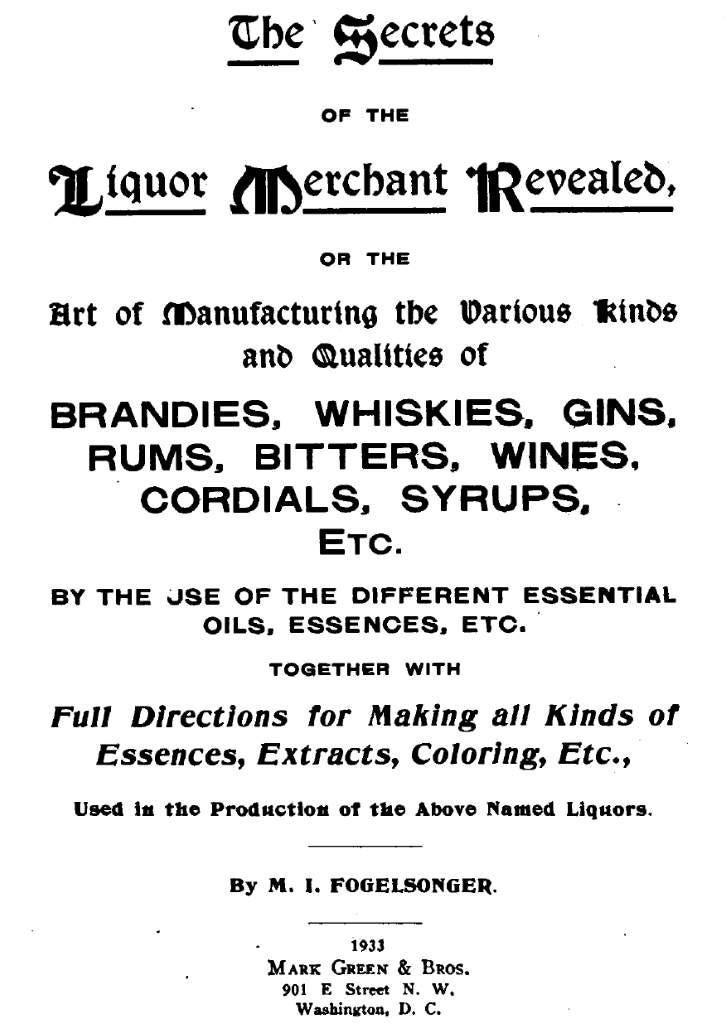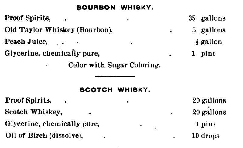 …it consists of mixtures of molasses spirit which were originally distilled at approximately 185° to 190° proof and to which were added ingredients to produce desired types of flavors. The molasses spirits are usually distilled with lime and soda, often in the presence of vegetable roots, coconut shells, and other substances. … There is a tendency to remove as much as possible of the original character due to fermentation of cane products and substitute a new character with added ingredients. … a formula of well-known brands consists of a mixture of distilled molasses spirit varying in proof from 145° to 190°, sherry, Madeira or other wines, often spirits of niter, bitter almonds, and raisins.