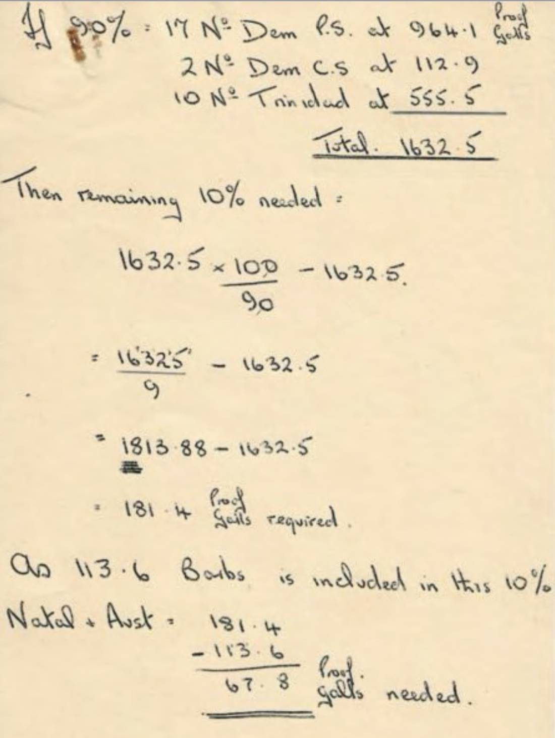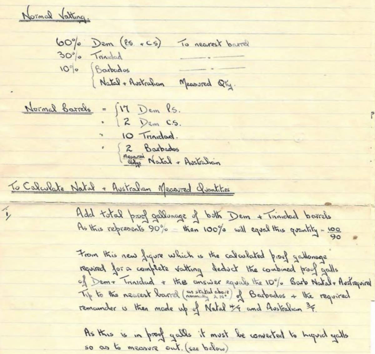 When we vatted, we first needed seventeen barrels of Demerara rum. So, we wheeled out seventeen barrels, tipped them in the vat. Then the barrels of Trinidad rum; wheel them out, tip them in the vat. Two barrels of Barbados rum; wheel them out, tip them in the vat. There was also a percentage of Natal and Australian, which we had to calculate—it was a small amount.